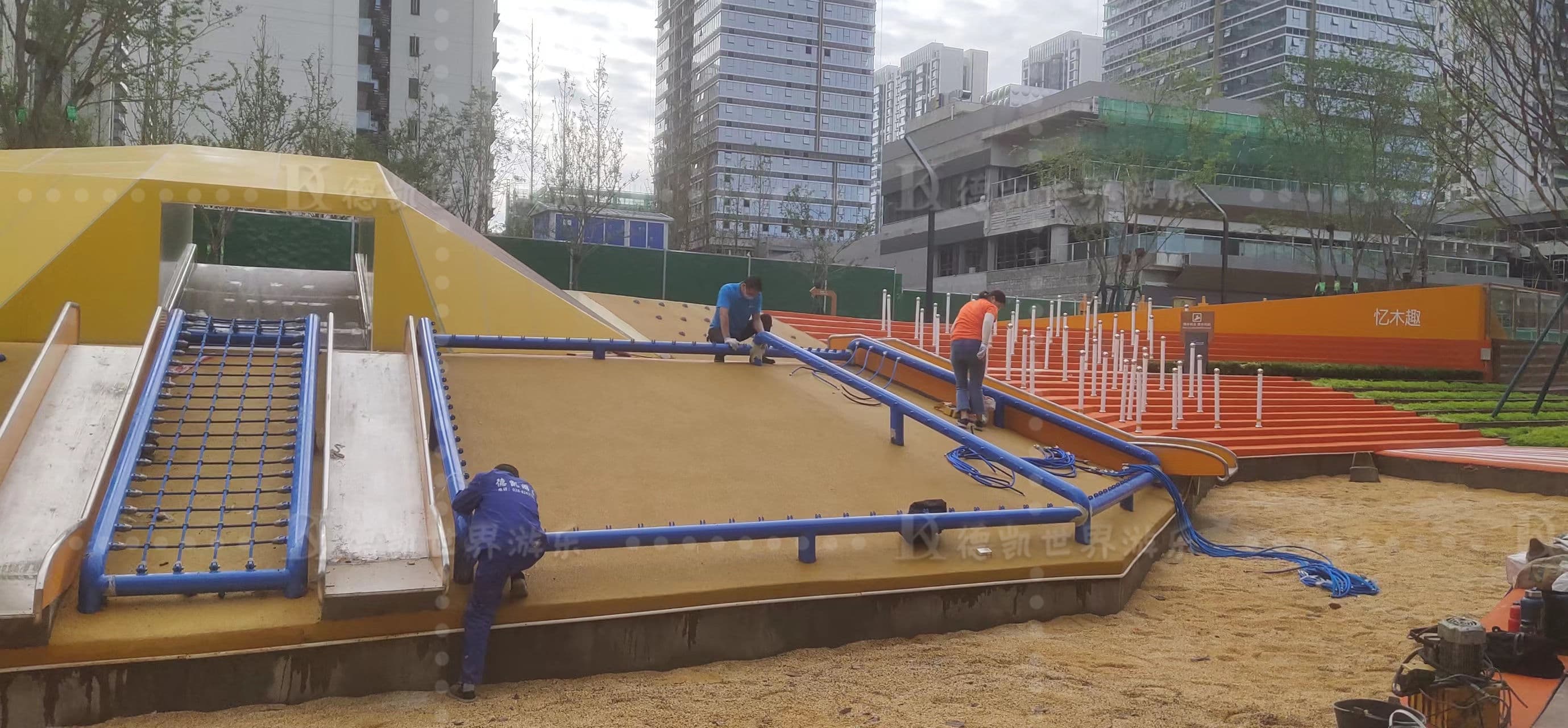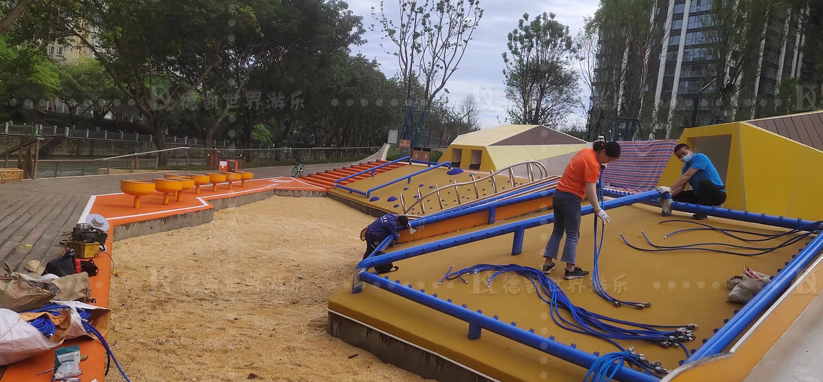 成都濱河公園游樂設(shè)施安裝完工,本著休閑娛樂,拓展運(yùn)動(dòng)為主。游樂設(shè)施涉及蹦床、滑梯、沙池、攀爬繩網(wǎng)、其它單品等,滿足不同年齡段人群互動(dòng)體驗(yàn)。