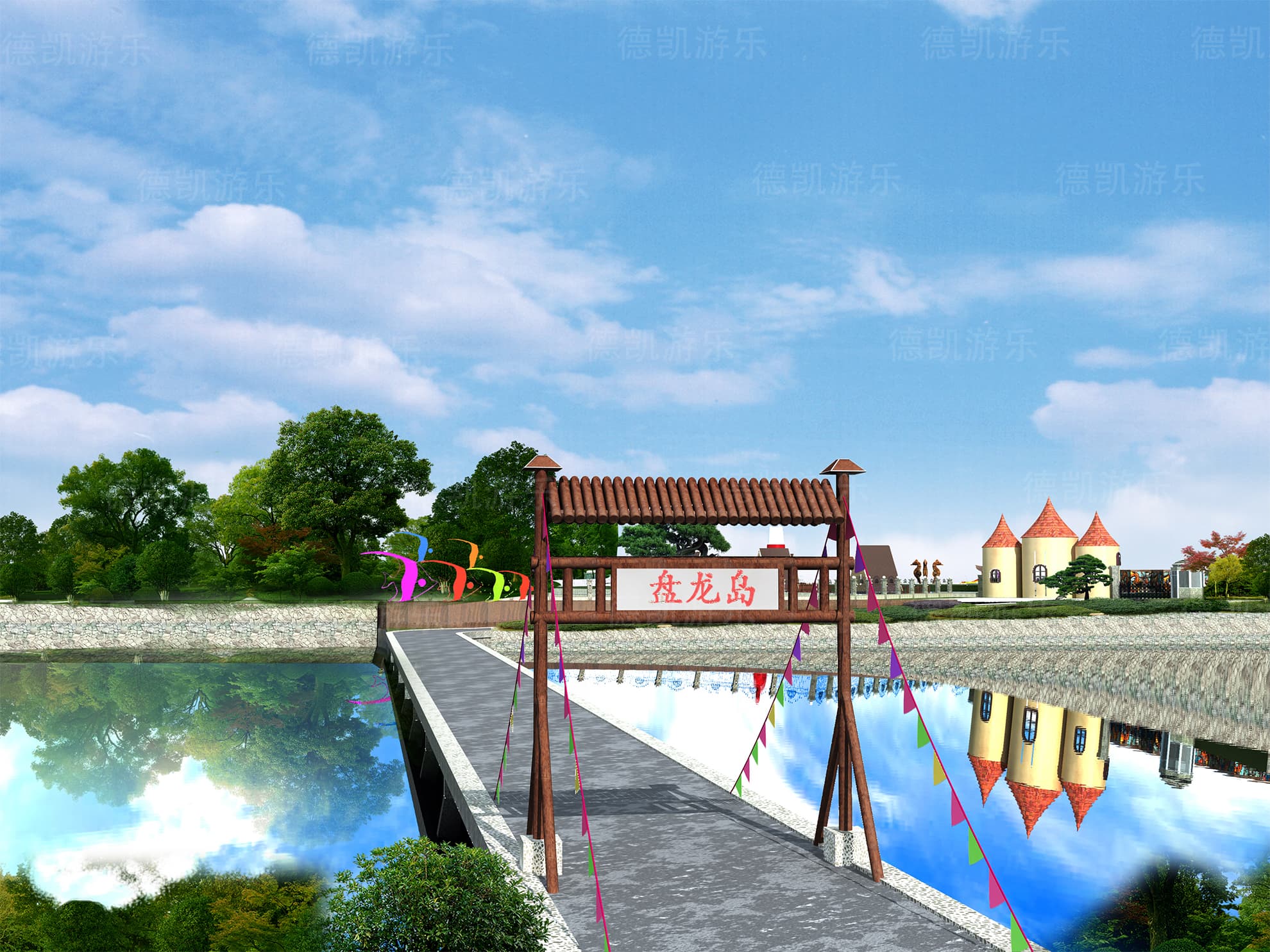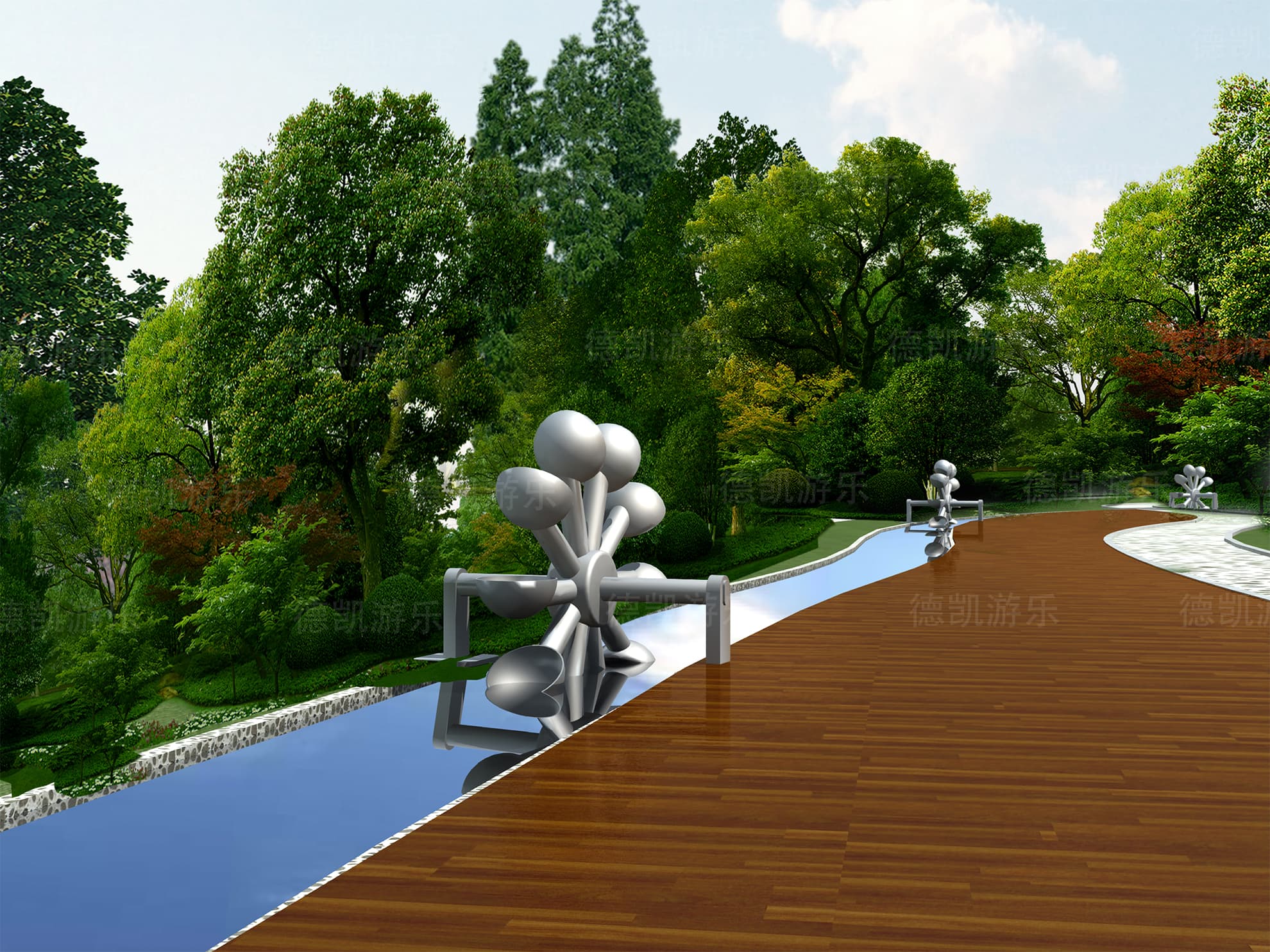 在這個(gè)角度看,整個(gè)項(xiàng)目完成后周圍環(huán)境就可以清晰的看見,因?yàn)橹饕揎椀氖俏覀兊脑O(shè)計(jì)部分,因此,設(shè)計(jì)區(qū)域的效果更好一些。彩虹門,水車又是激起孩子們探索興趣的寶貝,他們會(huì)歡快的穿過彩虹門,在小亭子休息一會(huì)會(huì),趕緊又跑到又水車的地方,探索水車運(yùn)轉(zhuǎn)的規(guī)律和樂趣。