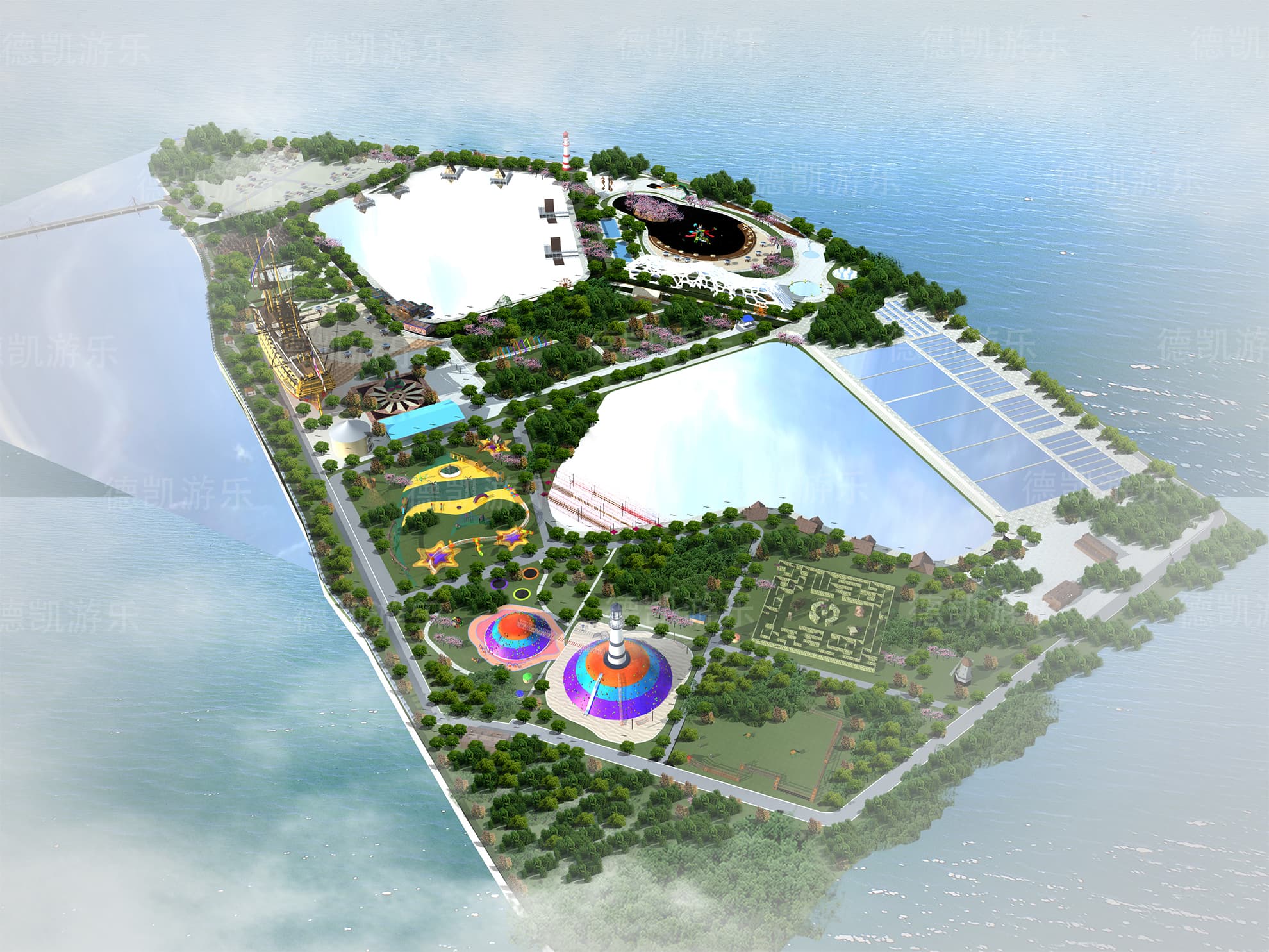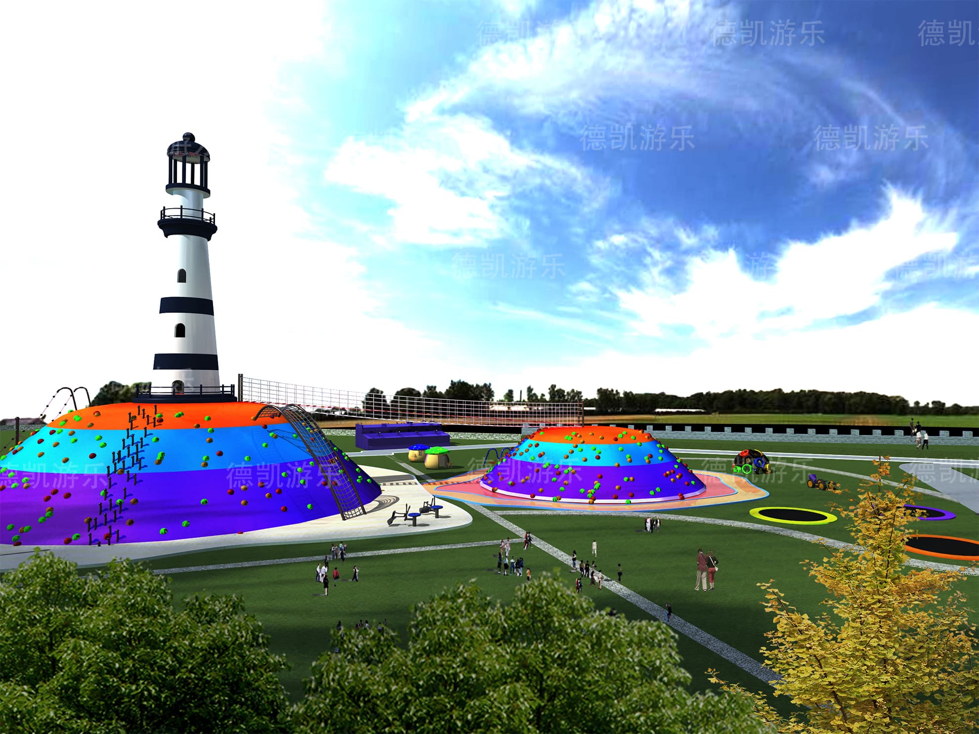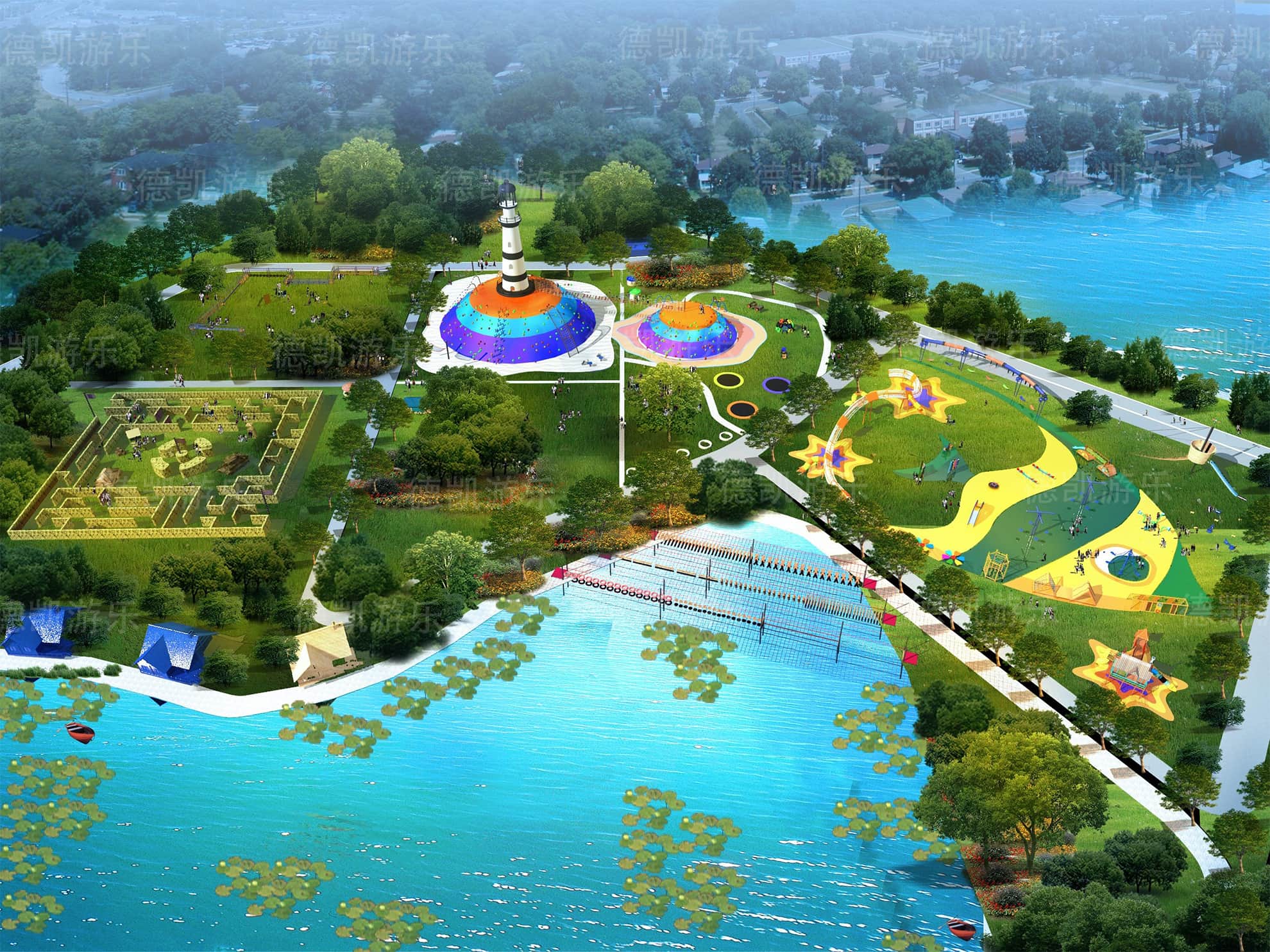 這部分主要呈現(xiàn)的是陸上無動(dòng)力兒童游樂設(shè)備,主要的能看見的有迷宮、燈塔、蹦床、兒童拓展組合、水上蕩橋部分、弧形秋千、爬網(wǎng)木桶組合等。