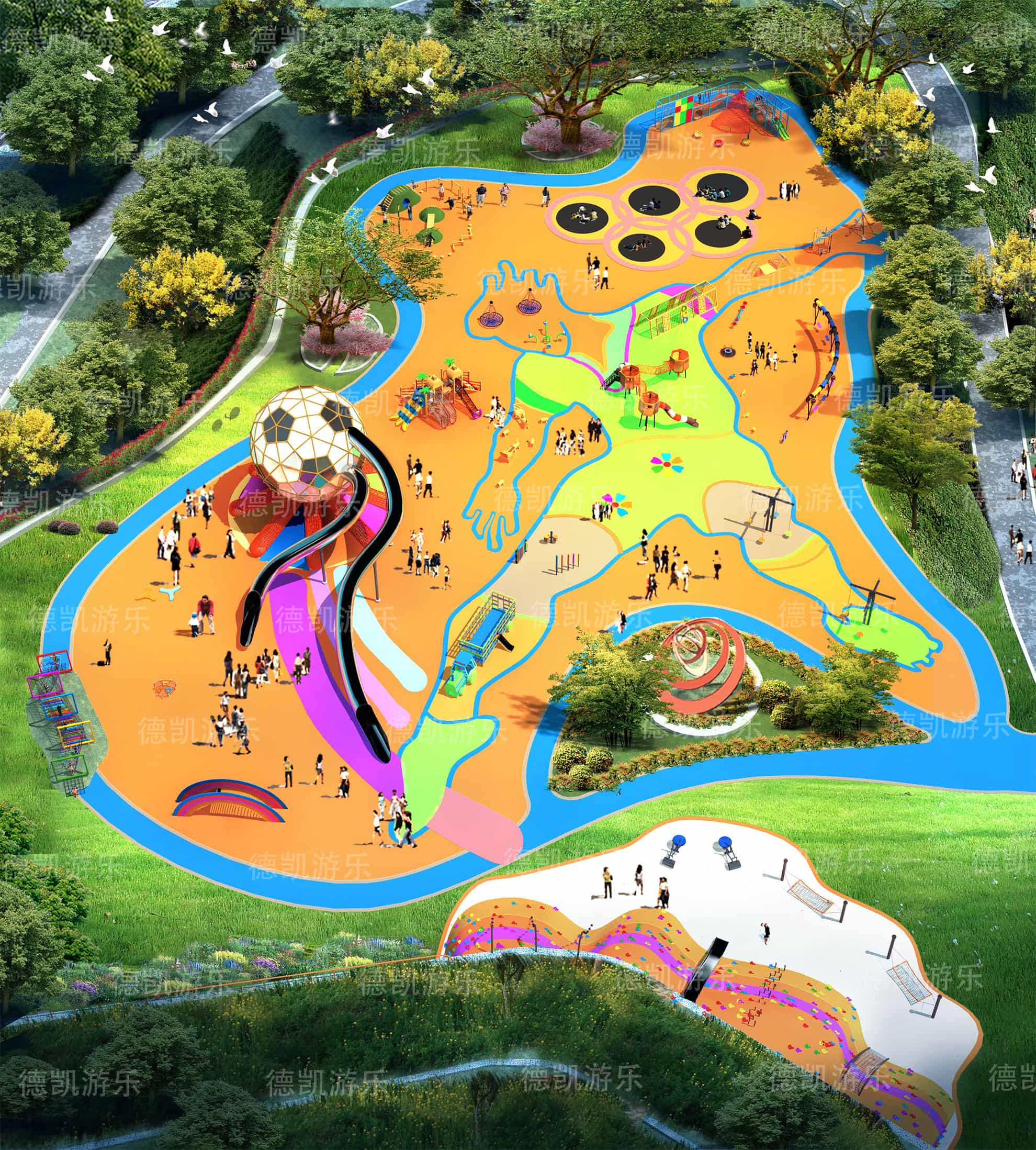 整個(gè)場地是以體育為核心建造的,霸氣的足球,瀟灑的踢球人的身姿,代表運(yùn)動的奧運(yùn)五環(huán),每一個(gè)細(xì)節(jié)都激勵孩子們要經(jīng)常運(yùn)動。以運(yùn)動為核心的游樂園吸引著孩子,并激勵著孩子們要經(jīng)常運(yùn)動,時(shí)時(shí)刻刻鍛煉。場地的運(yùn)動雕塑、足球滑梯的造型,精致的五環(huán),運(yùn)動員矯健的身姿,吸引著孩子們的目光。