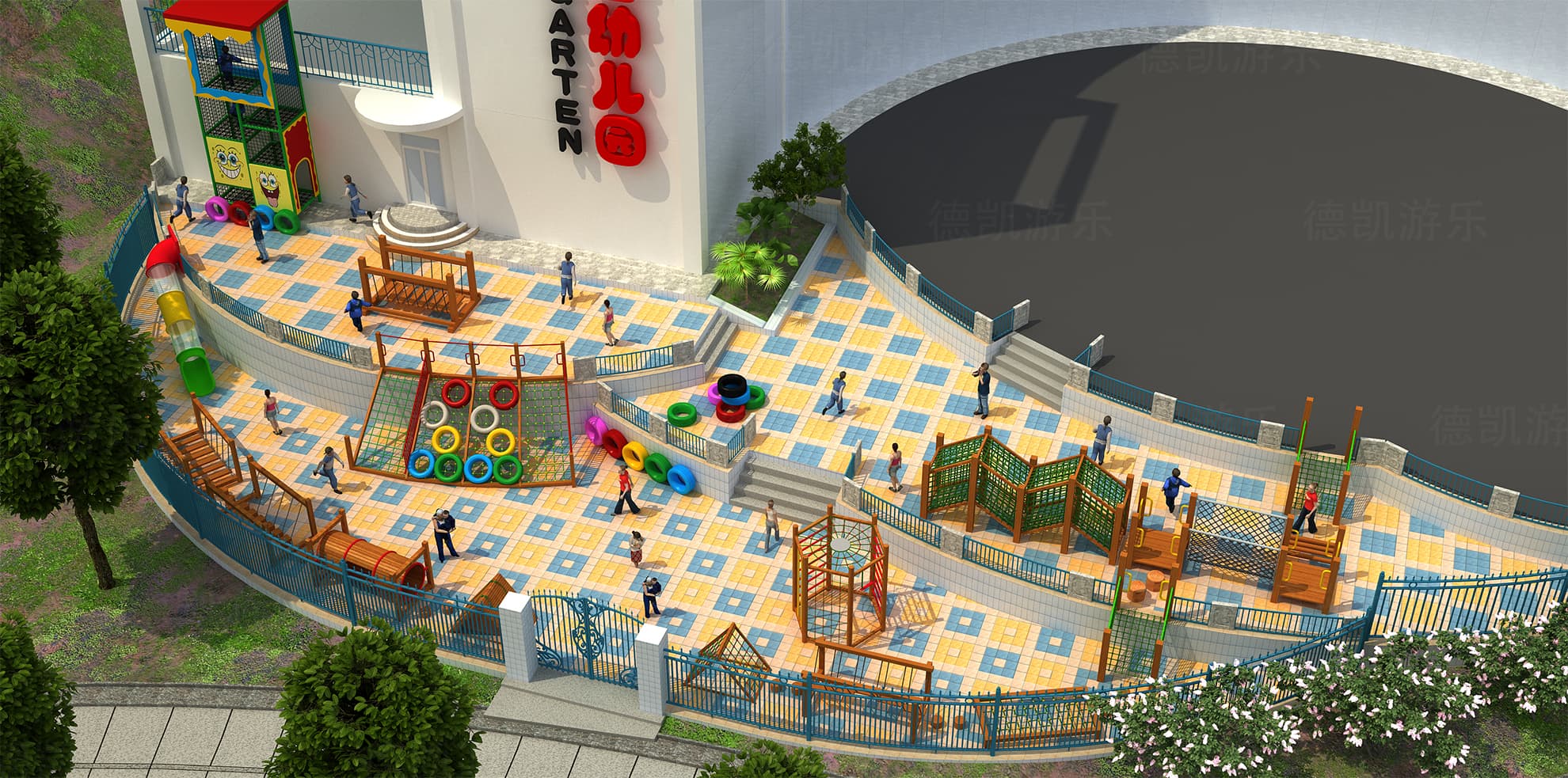 在俯視效果圖里面,我們可以看出整個園子的東西,木質拓展、爬網、滑桶、蕩橋等,一個個雅致的游樂設備點綴著單調的幼兒園。而且設備大部分的材料大部分都是木材,對于抵抗力弱的孩子們來說,健康、環(huán)保才不會對他們的身體健康造成負擔。就整體而言,設備比較簡單,挑戰(zhàn)難度不高,冒險性很低,很符合這個幼兒園的主要玩耍人群。